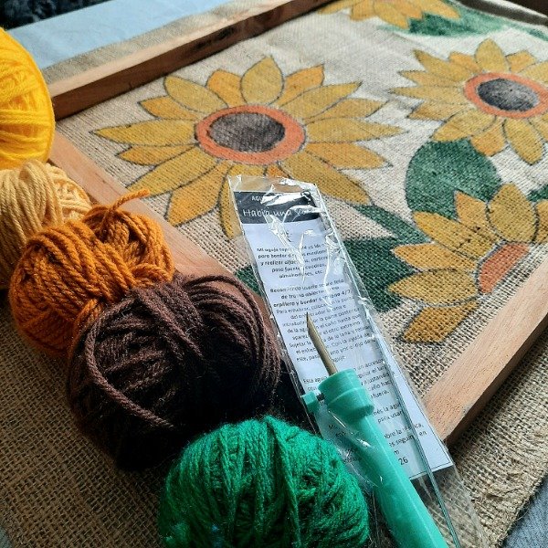 Este Kit contiene bastidor de madera de 45x40cm, tela arpillera con diseño a color de 50 x 50 cm, lanas para el proyecto y aguja tapetera mediana.