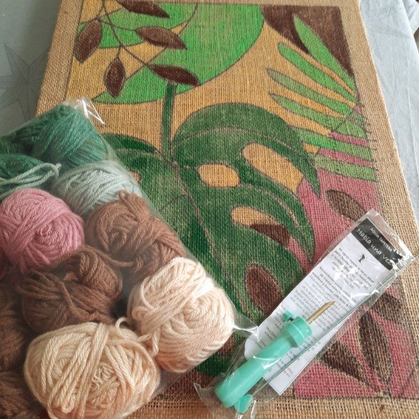 Este Kit contiene bastidor de madera de 45x40cm, tela arpillera con diseño a color , lanas para el proyecto y aguja tapetera mediana.