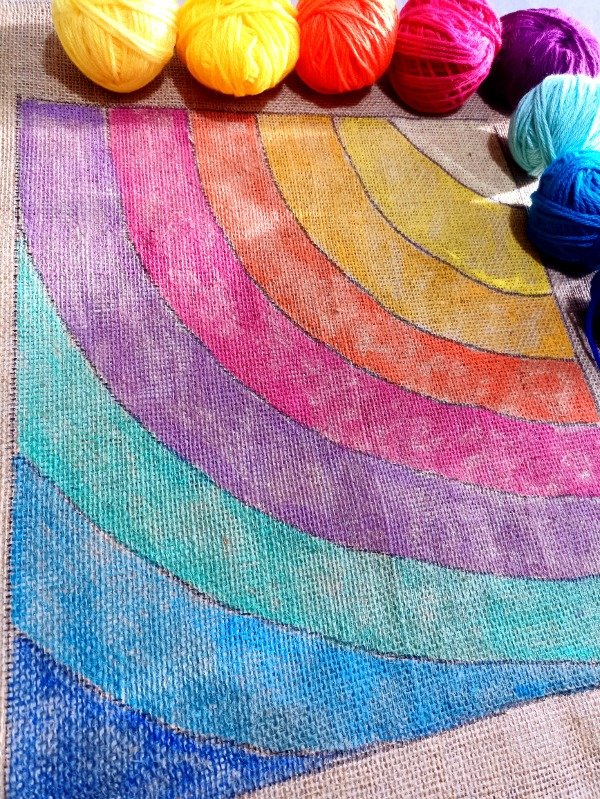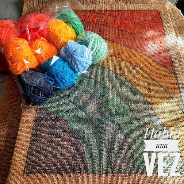 Este Kit contiene bastidor de madera de 45x35cm, tela arpillera con diseño a color de 50 x 50 cm, lanas para el proyecto y aguja tapetera mediana.
