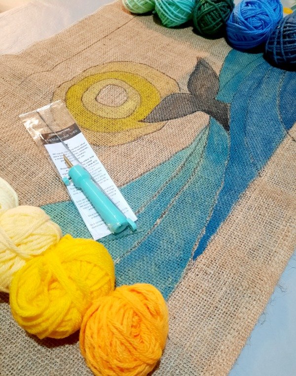Este Kit contiene bastidor de madera de 45x40cm, tela arpillera con diseño a color de 50 x 50 cm, lanas para el proyecto y aguja tapetera mediana.