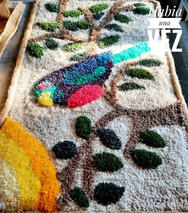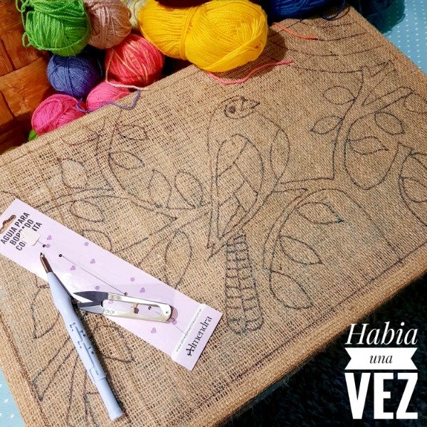 Este Kit contiene bastidor de madera de 45x40cm, tela arpillera con diseño a color de 50 x 50 cm, lanas para el proyecto y aguja tapetera mediana.