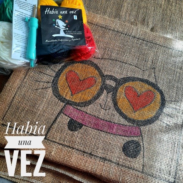 Este Kit contiene bastidor de madera de 45x35cm, tela arpillera con diseño a color de 50 x 50 cm, lanas para el proyecto y aguja tapetera mediana.