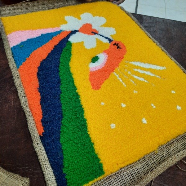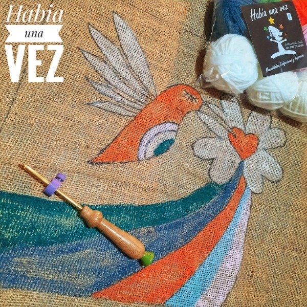Este Kit contiene bastidor de madera de 45x40cm, tela arpillera con diseño a color de 50 x 50 cm, lanas para el proyecto y aguja tapetera mediana.
