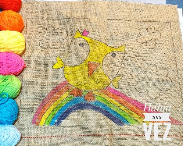 Este Kit contiene bastidor de madera de 45x35cm, tela arpillera con diseño a color de 50 x 50 cm, lanas para el proyecto y aguja tapetera mediana.